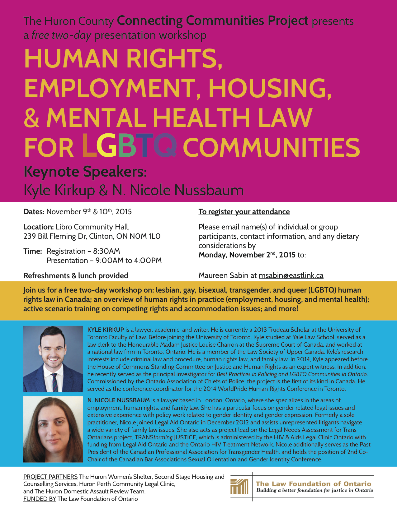 For example, in November 2015, Kyle partnered with N. Nicole Nussbaum to facilitate a two-day workshop on human rights, employment, housing, and mental health law for LGBTQ communities. The workshop was supported by the Law Foundation of Ontario. Below is a sample of the workshop materials.